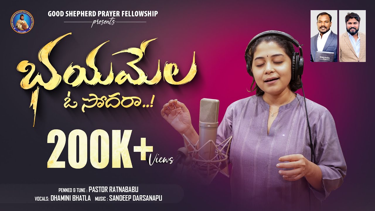 Bhayamela O Sodara is the latest Christian Telugu song written, tuned by Pastor Ratna Babu, sung by Damini Bhatla and music composed by Sandy Sandeep. This song was released on March 31, 2024 through Good Shepherd prayer fellowship Vyr YouTube channel.